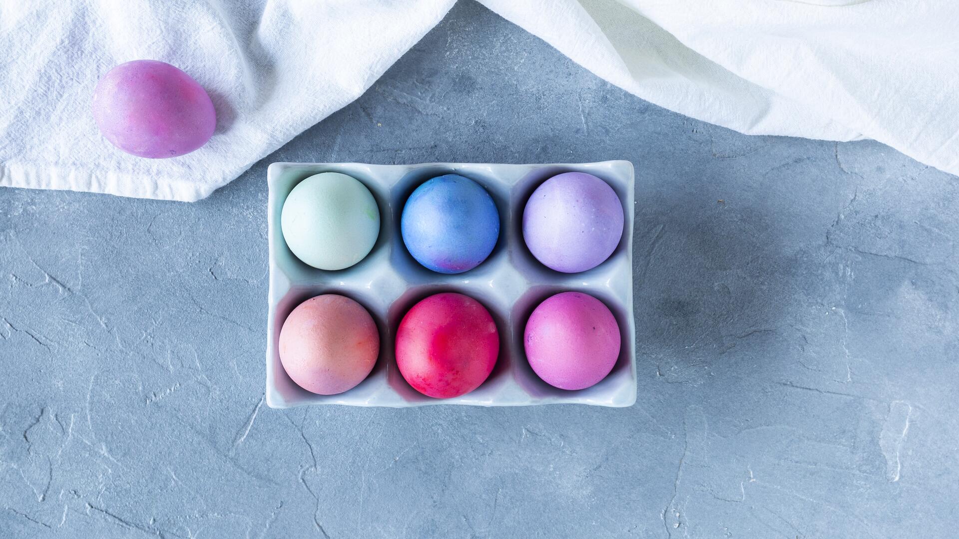 Hierfür je 3 Eier, Eierfarbe zum Heißfärben und 2-3 EL Essig in einen Gefrierbeutel geben. So viel Wasser dazugeben, dass die Eier vom Wasser bedeckt sind.