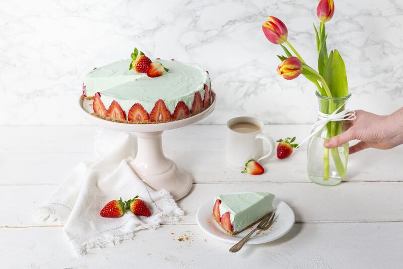 Zugegeben, diese Torte fällt streng genommen nicht in die Kategorie "Backen", denn für die Zubereitung dieser Philadelphia-Torte brauchst du keinen Backofen. Stattdessen bereitest du im Mixtopf einen Keksteig zu, den du in einer Springform verteilst und mit einer herrlich duftenden Waldmeistercreme berstreichst. Erdbeeren nicht vergessen!