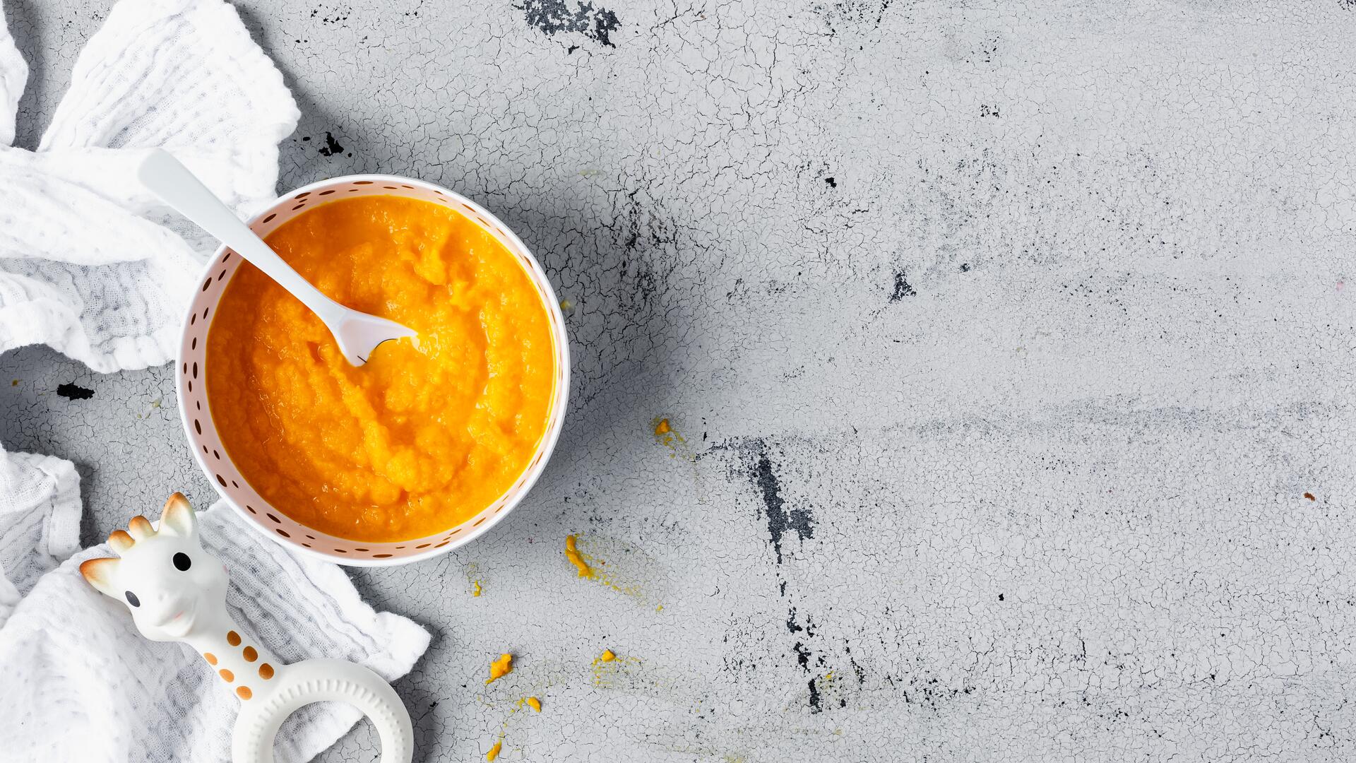 - Die ersten Versuche startest du zur Mittagszeit mit einem einfachen Gemüsebrei – Karotte, Pastinake oder auch Kürbis, ganz fein püriert, eventuell mit etwas Mutter- oder Säuglingsmilch angerührt. Bleib in den ersten Tagen auf jeden Fall bei einer Sorte Gemüse. Nach und nach kannst du dann Kartoffeln und etwas Öl unterrühren.
