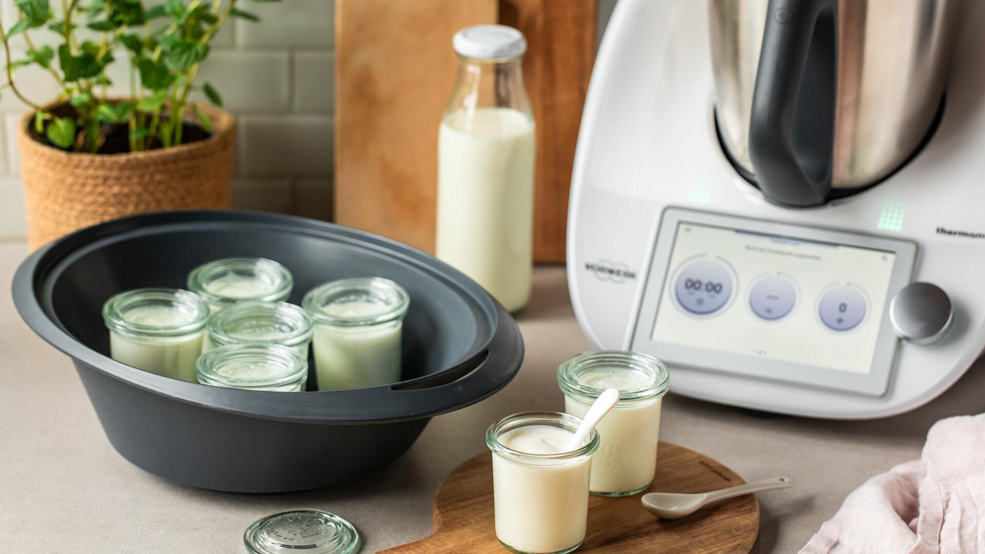 Mit dem Thermomix® lässt sich Joghurt leicht selbst herstellen, wobei man die Kontrolle über die Inhaltsstoffe hat. Für 8 Portionen benötigt man 120 g Naturjoghurt, 800 g Vollmilch, 250 g Wasser, 20 g Zitronensaft und optional Inulin für mehr Festigkeit. Die Mischung wird im Thermomix® verrührt und erwärmt, anschließend in Gläser gefüllt und entweder mit dem Fermentier-Programm oder an einem warmen Ort fermentiert. Der fertige Joghurt wird im Kühlschrank etwa eine Woche haltbar. Auch fettarme oder laktosefreie Milch sind möglich, allerdings weniger cremig. Selbstgemachter Joghurt kann als Starter verwendet werden, Inulin oder längeres Fermentieren helfen bei zu flüssigem Joghurt. Joghurt kann auch aus pflanzlicher Milch zubereitet werden.