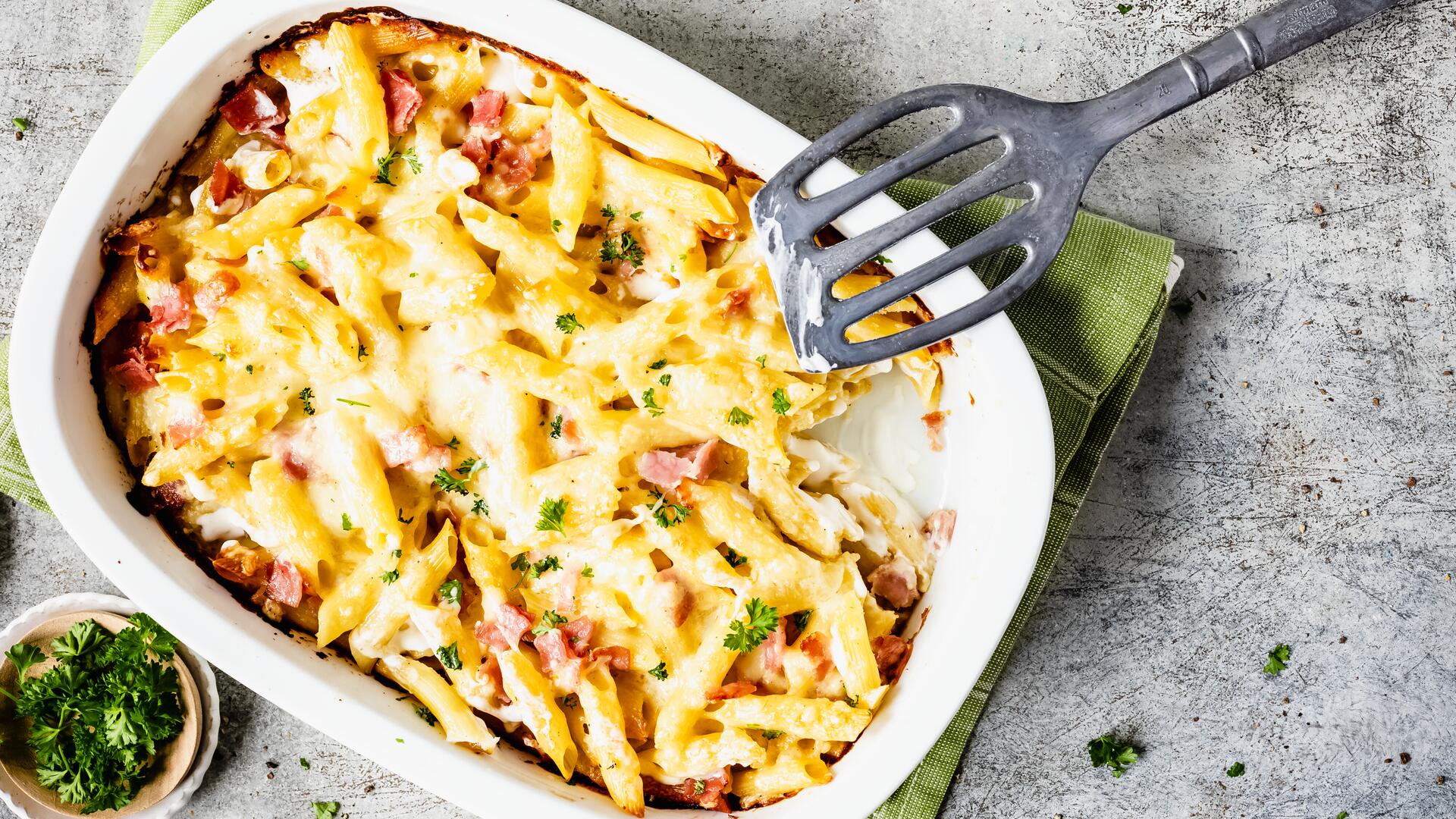 Der cremige Klassiker steht bei vielen Familien ganz weit oben in der Favoritenliste. Für die cremige Konsistenz sorgen Butter und Sahne. Speckwürfel geben den Geschmack und obendrauf ist eine super knusprige Käseschicht. So lecker!