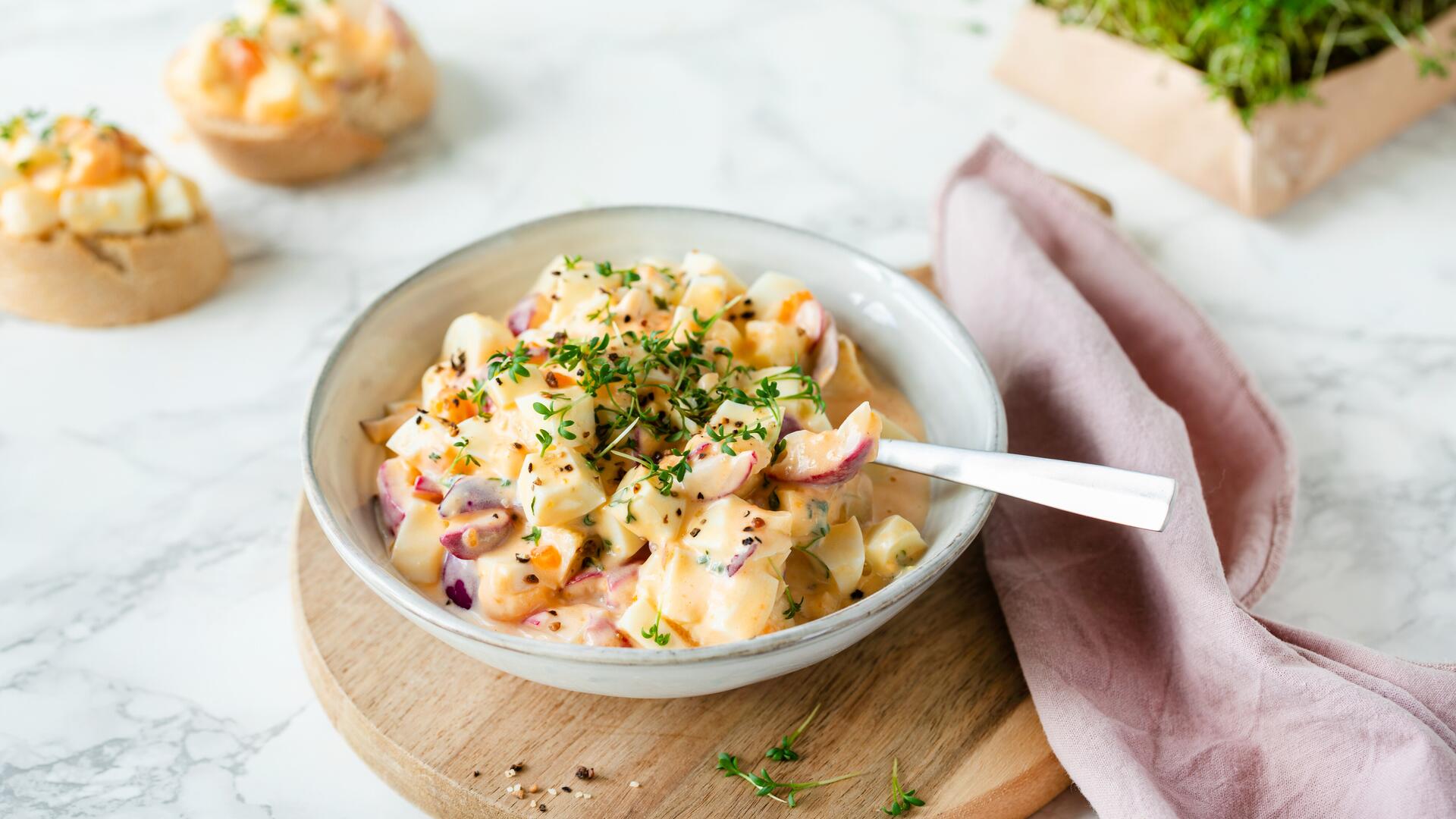 Eiersalat ist ein absoluter Klassiker zum Frühstück oder Brunch und die perfekte Möglichkeit, übriggebliebene Eier zu verwerten. Dési zeigt dir, wie einfach die Zubereitung ist und hat auch ein paar Tipps und Tricks für die Handhabung der Eier parat.